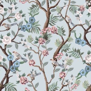 טפט בסגנון סיני עם עצי אדמונית וציפורים לחדרי אוכל
